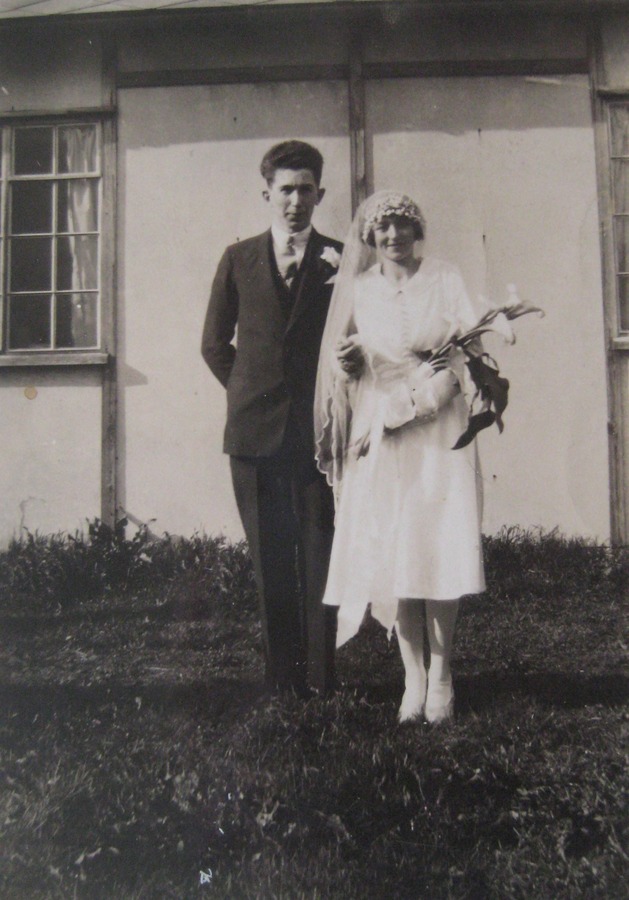19300400 Edie Rowe married Lance Younger April 1930 pic outside Bulmer Village Hall