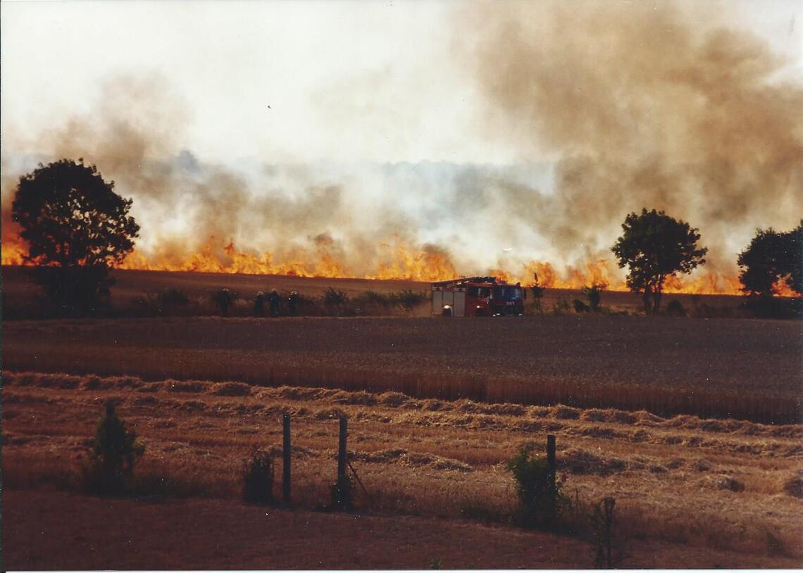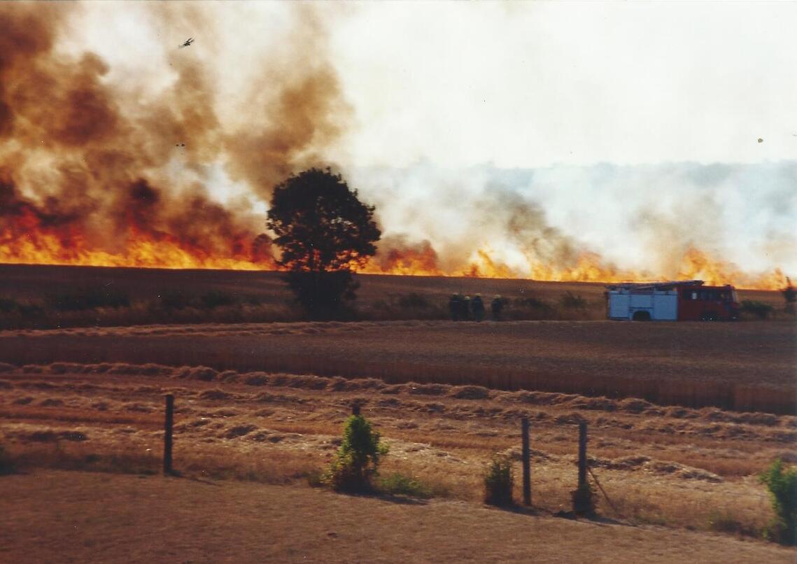 A procession of fire engines soon arrived. They, of course, headed to where the burning combine was, but the hedge stopped them from getting to where they were needed in the next field. We tried stopping the fire engines as they arrived, to direct them where to go, but none of them paid any heed, each one driving round the field and then back out before following our directions and I believe there were eight of them. The ferocity of the flames was intense with clouds of very black smoke rising above the burning crop.