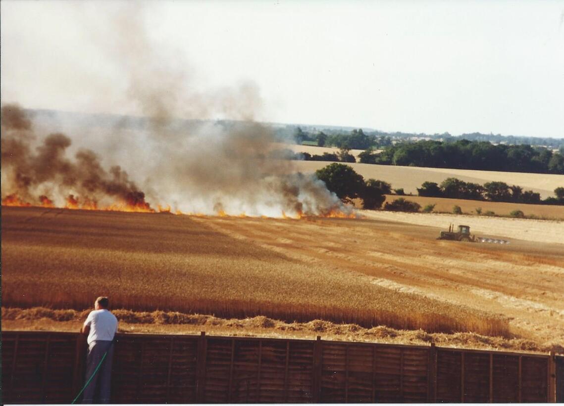 However, on Sunday 6th August, there was calamitous happening on the back field, the Auberies Farm combine caught fire! The fire rapidly spread to the straw and the standing wheat and jumped the hedge into Ashley’s unharvested wheat. We were fearful for our own homes, as it also spread right up to the edge of our tinder dry gardens.