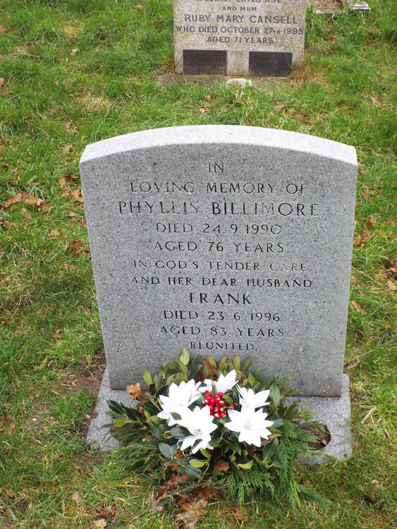 Billimore, Phyliss                           24/09/1990              5/13                In Loving Memory of Phyllis Billimore Died 24.9.1990 Aged 76 Years. In God's Care and Her Husband Frank  Died 2.6.1996  Aged 83 Years.  Reunited