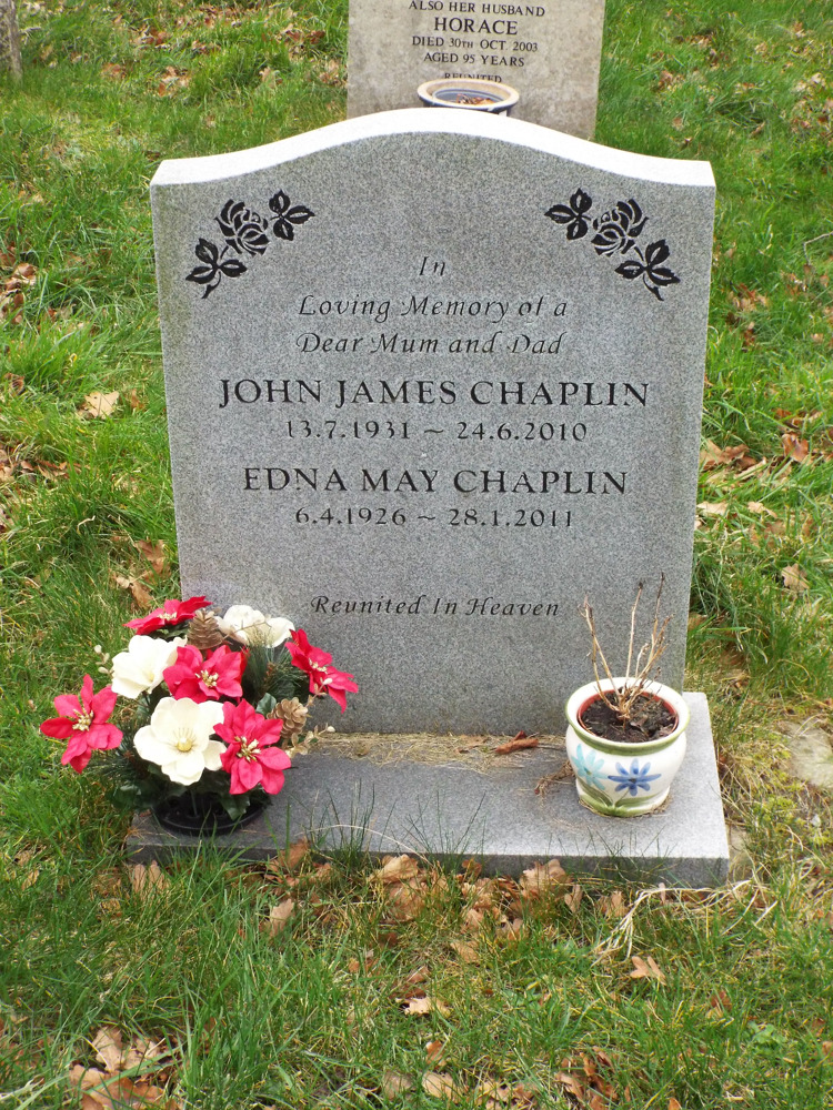 Chaplin, John James                              24/06/2010          6/17                 In Loving Memory of a Dear Mum and Dad.  John James Chaplin  13.7.1931 - 24.6.2010.   Edna May Chaplin  6.4.1926 - 28.1.2011.  Reunited in Heaven