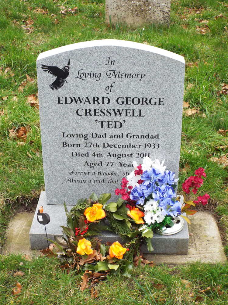 Cresswell, Edward George                      04/08/2011           6/18              In Loving Memory of Edward George "Ted"  Loving Dad and Grandad  Born 27th December 1933  Died 4th August 2011   Aged 77 years  Forever a Thought, Often a Tear, Always a Wish That You Were Here