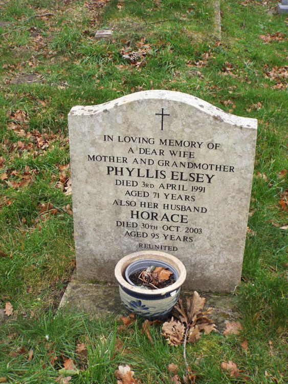Elsey, Phyllis                                         03/04/1991              5/19              In loving Memory of a Dear Wife Mother and Grandmother Phyllis Elsey  Died 3rd April 1991  Aged 71  also Her Husband  Horace  Died 30th Oct 2003 Aged 95 Years.  Reunited