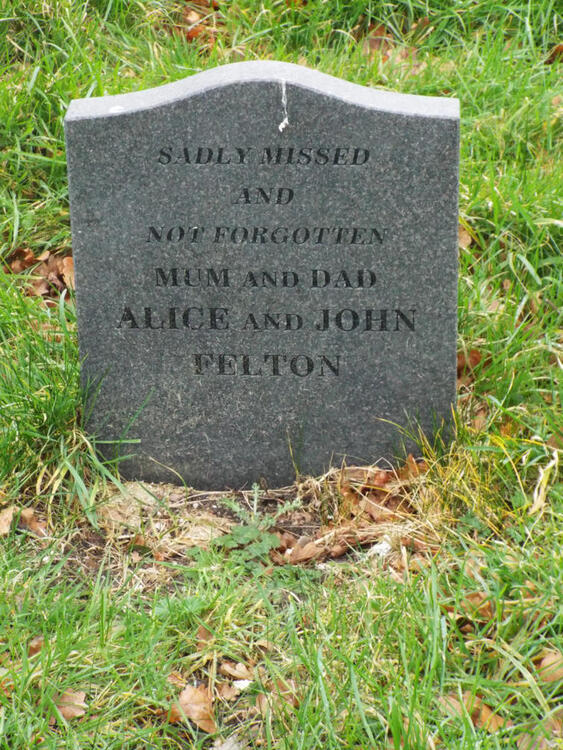 Felton, J                                                                               3/12                   Inscription reads "Sadly missed and not forgotten  Mum and Dad  Alice and John Felton"