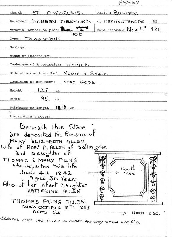 Allen, Mary Elizabeth 04/06/1842 and Thomas Pung 10/10/1887 and Katherine ?? 106 W3W