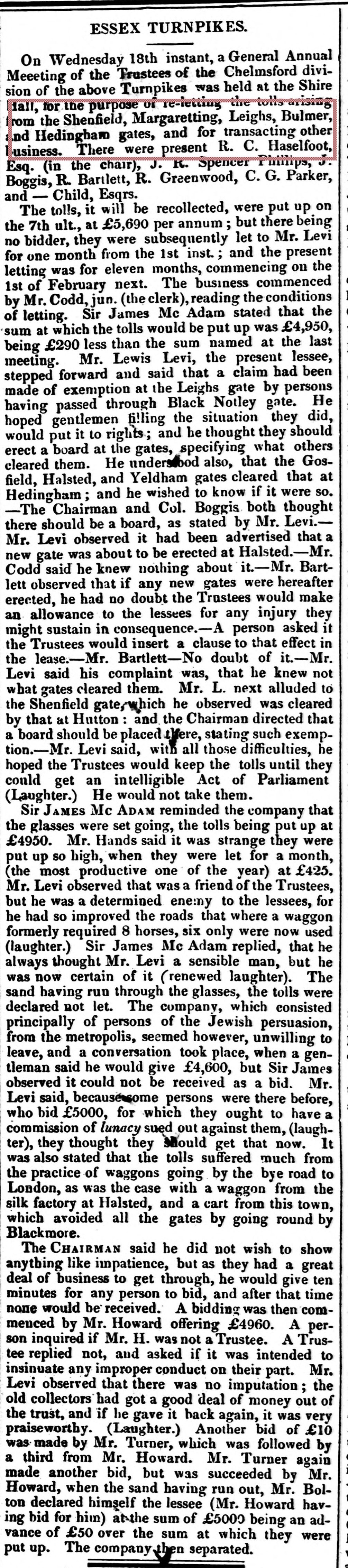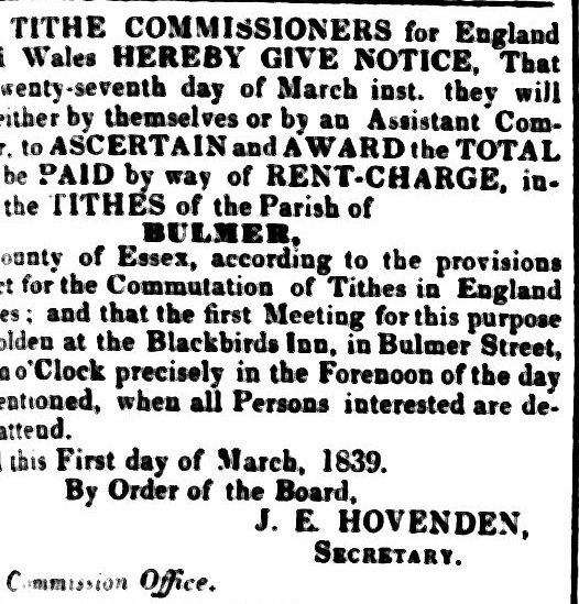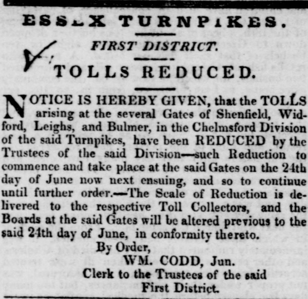 Bulmer Toll Gate is belived to have been sited at Bulmer Tye, South side of the River Stour bridge, building nolonger exists. The premises were managed according to the census of 1841 and 1851 by Abiathar & Lucy Walford, and in 1861 the tenants were William and Mary Dixey. Although the article below published in 1848 states that the Bulmer Tollgate is to close.