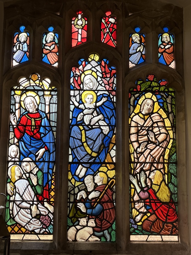 It consists of three large panels with smaller tracery above , the overall measurements being about 10ft by 7ft. The central panel portrays the Nativity, left hand panel depicts the rising of the centurions daughter and the righthand shows Christ appearing before his Mother after the resurrection.