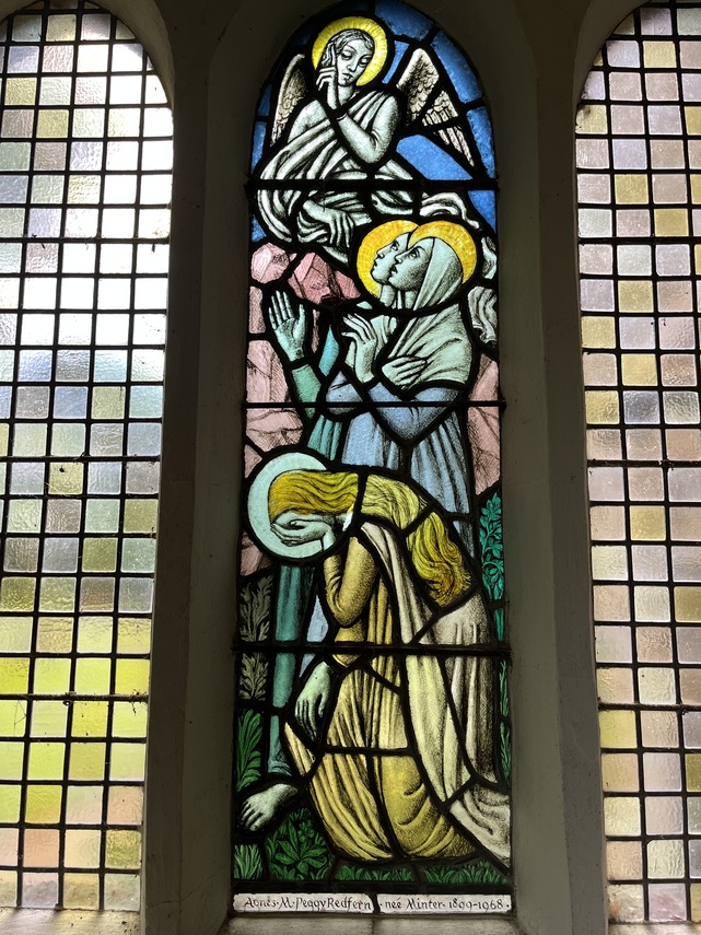 Mrs Minter-Cooper, who designed the window, is the wife of the well known artist Mr Gerald Cooper IDA. principal of Wimbledon School of Art. She has designed windows for over a score of churches.