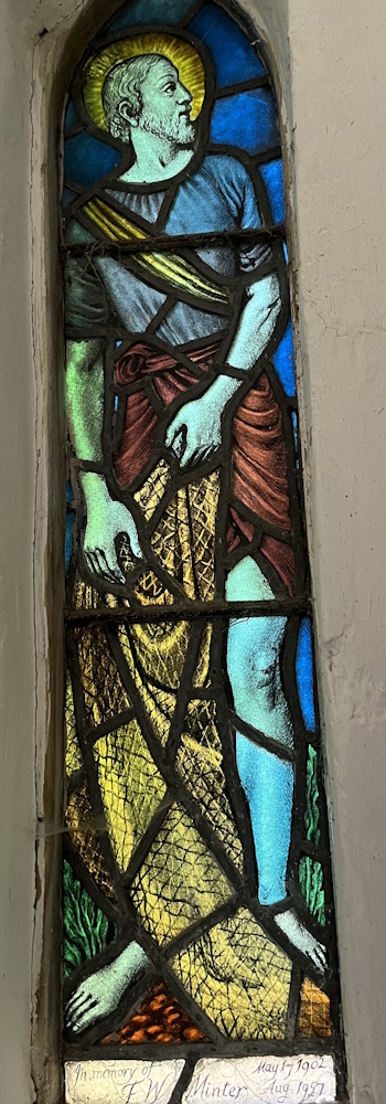 The window was designed and executed by Mrs Muriel Minter-Cooper A.R.C.A. and erected by Mr L. A. Minter of the Brickfields, Bulmer. both children of the late Mr and Mrs A.E. Minter.