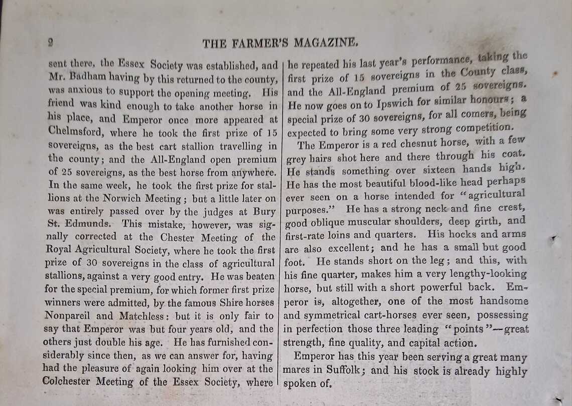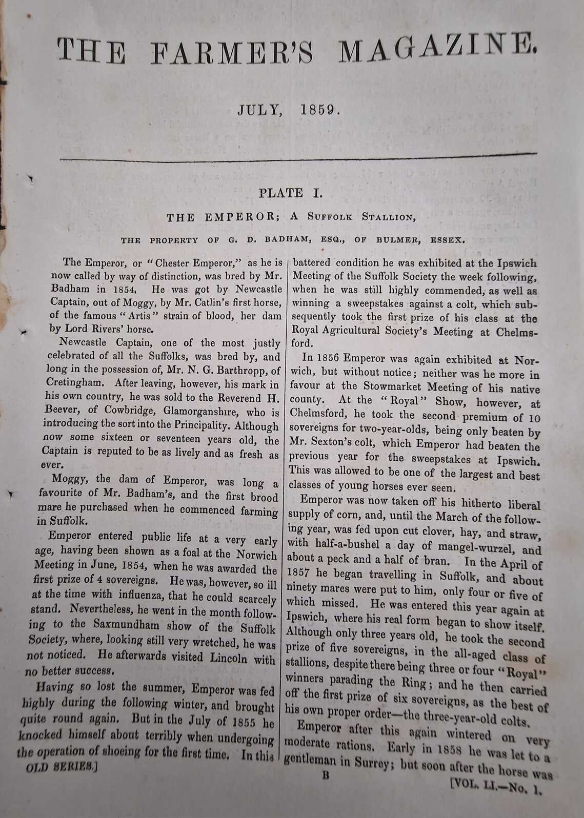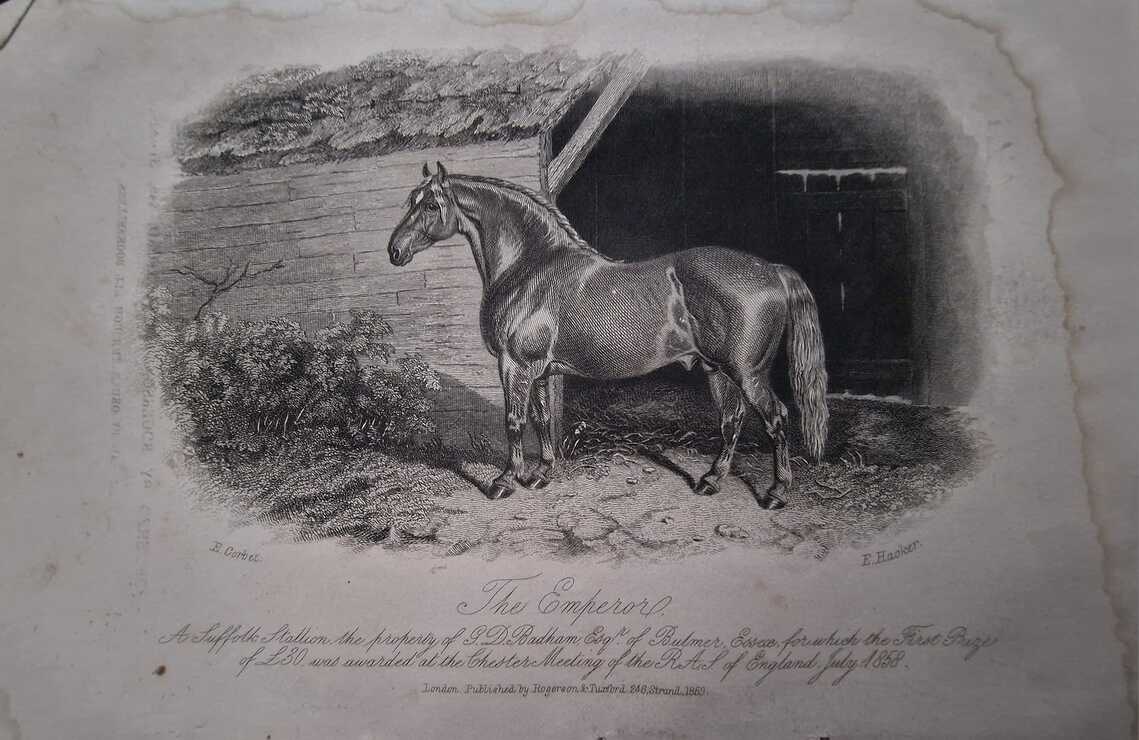 The Emperor, a Suffolk Stallion belonging to George David Badham of Bulmer that won first prize at Chester Meeting of the Royal Agricultural Society in 1858. Article appeared in 'The Farmer's Magazine' in July 1859. Mr Badham was a noted Agriculturalist and Animal Breeder who was born in Bulmer in 1807. He lived in Whitton outside Ipswich before moving back to Jenkins Farm in the village in 1858. He died in Bulmer in 1877. His gravestone can be viewed here.....