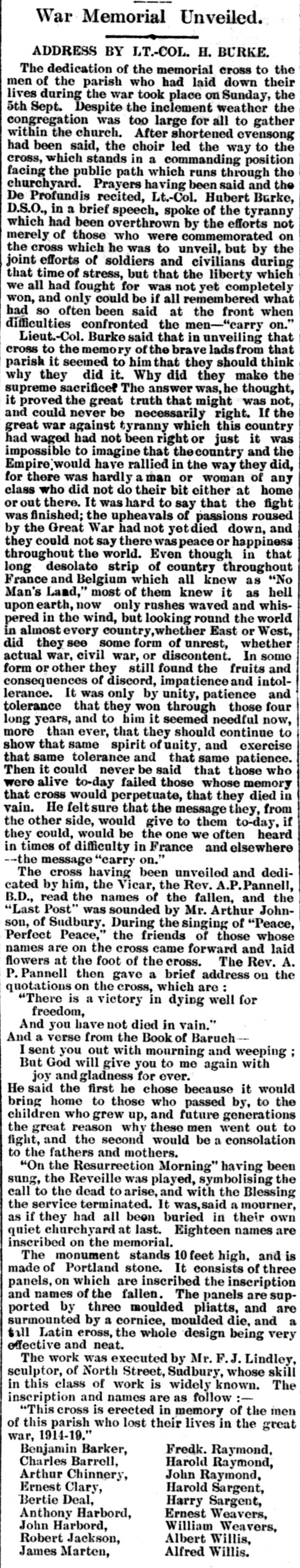 ** The unveiling of the memorial by LT. Col. H Burke in September 1920 can be read here **
